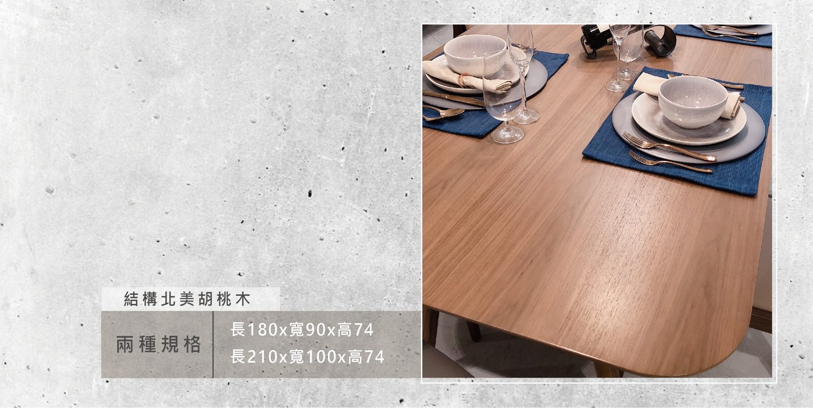 丹麥風格沈穩內斂、高貴優雅,線條簡約採用北美胡桃實木框架, 漸縮型及斜出的木腳設計,讓圍繞這餐桌的人們打從心裡都不由自主的輕鬆愉悅起來了呢!